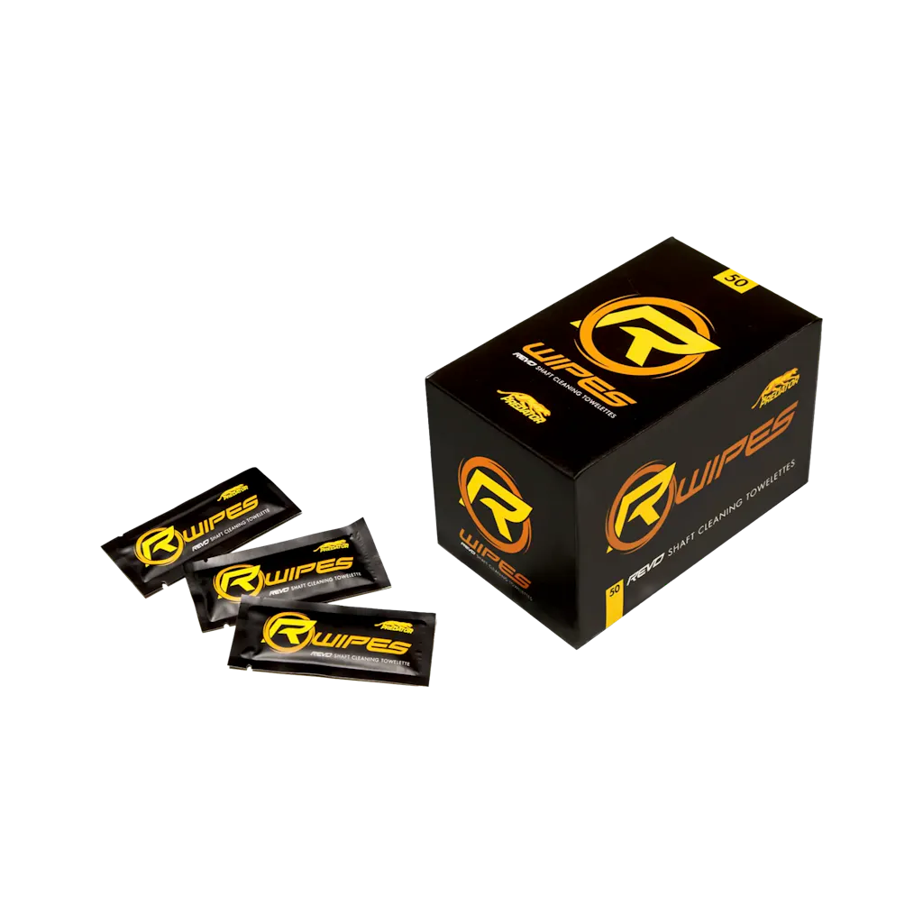 Safely and quickly clean your Predator REVO 12.4, REVO 12.9, or BK-R carbon shaft. Each box contains 50 individually packaged 5” x 8.5” (12.7cm x 21.59cm) R-Wipe towelettes developed to keep your REVO shaft’s low-friction surface in tip-top condition.